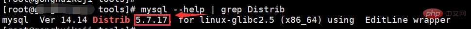 [root@heyong tools]# mysql --help | grep Distrib mysql Ver 14.14 Distrib 5.7.17, for linux-glibc2.5 (x86_64) using EditLine wrapper