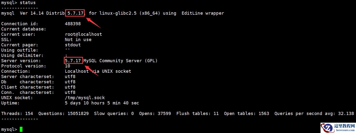 mysql> status -------------- mysql Ver 14.14 Distrib 5.7.17, for linux-glibc2.5 (x86_64) using EditLine wrapper Connection id: 488398 Current database: Current user: root@localhost SSL: Not in use Current pager: stdout Using outfile: '' Using delimiter: ; Server version: 5.7.17 MySQL Community Server (GPL) Protocol version: 10 Connection: Localhost via UNIX socket Server characterset: utf8 Db characterset: utf8 Client characterset: utf8 Conn. characterset: utf8 UNIX socket: /tmp/mysql.sock Uptime: 5 days 10 hours 5 min 40 sec Threads: 154 Questions: 15051829 Slow queries: 0 Opens: 37599 Flush tables: 11 Open tables: 1563 Queries per second avg: 32.138 -------------- mysql>
