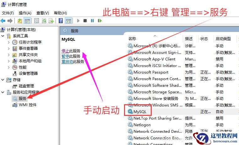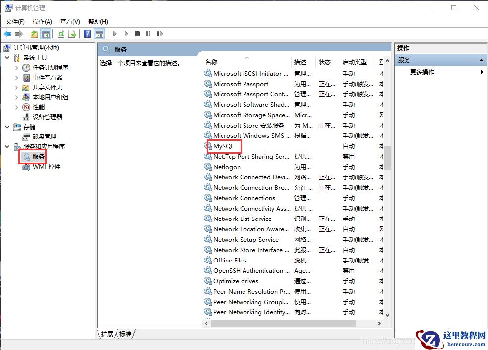 那么先检查一下服务里面有没有mysql服务 此电脑==》管理==》服务和应用程序==》服务 如下图