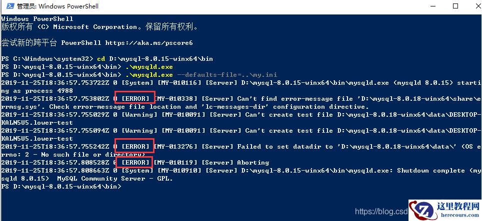 这里因为没有my.ini告诉mysqld程序mysql主目录在那以及数据源在那,导致执行失败