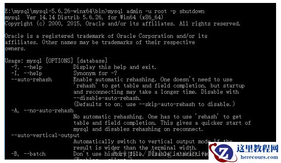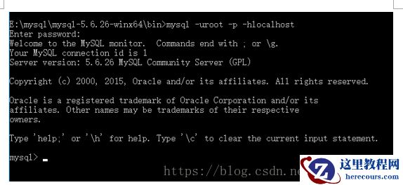 E:\mysql\mysql-5.6.26-winx64\bin>mysql-uroot -p –hlocalhost