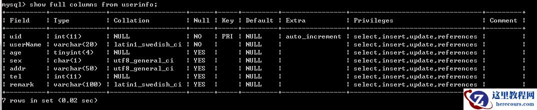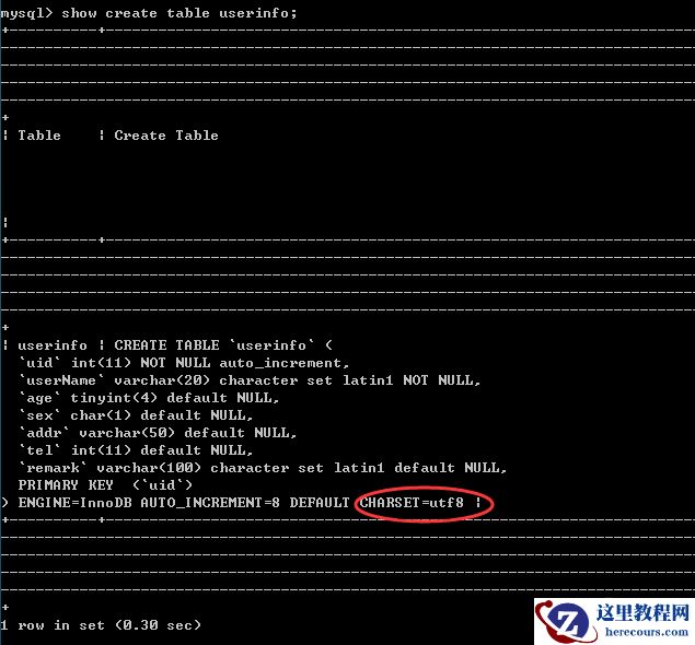 a、show variables like '%char%'; ---查看编码设置 b、show create database 数据库名; ---查看该数据库的编码格式 c、show create table 表名; ----查看该表的编码格式 d、show full columns from 表名; ---可以查看该表格字段的属性