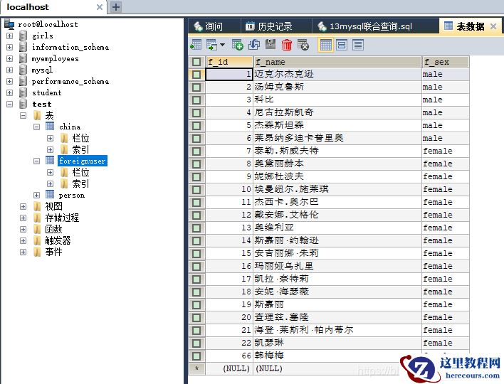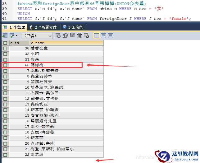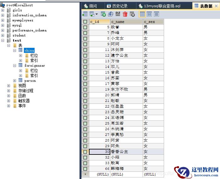 #联合查询 # SELECT * FROM employees WHERE department_id > 90 OR email LIKE '%a%'; #使用UNION联合查询 SELECT * FROM employees WHERE department_id > 90 UNION SELECT * FROM employees WHERE email LIKE '%a%'; # USE test; #案例:查询中国用户中女性的信息以及外国用户中女性的用户信息 SELECT c.`c_id`, c.`c_name`, c.`c_sex` FROM china c WHERE c_sex = '女' UNION SELECT f.`f_id`, f.`f_name`, f.`f_sex` FROM foreignUser f WHERE f_sex = 'female'; #china表和foreignUser表中都有66号韩梅梅(UNION会去重) SELECT c.`c_id`, c.`c_name` FROM china c WHERE c_sex = '女' UNION SELECT f.`f_id`, f.`f_name` FROM foreignUser f WHERE f_sex = 'female'; #china表和foreignUser表中都有66号韩梅梅(UNION ALL 不会去重) SELECT c.`c_id`, c.`c_name` FROM china c WHERE c_sex = '女' UNION ALL SELECT f.`f_id`, f.`f_name` FROM foreignUser f WHERE f_sex = 'female';