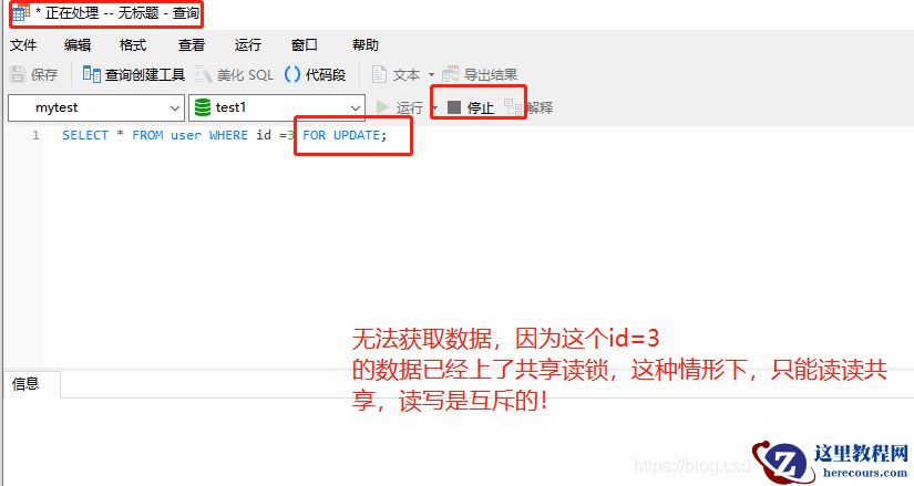 3.那么也是基于当前情况,我们再执行一下使用排他写锁的查询语句,可以发现 读写互斥了: