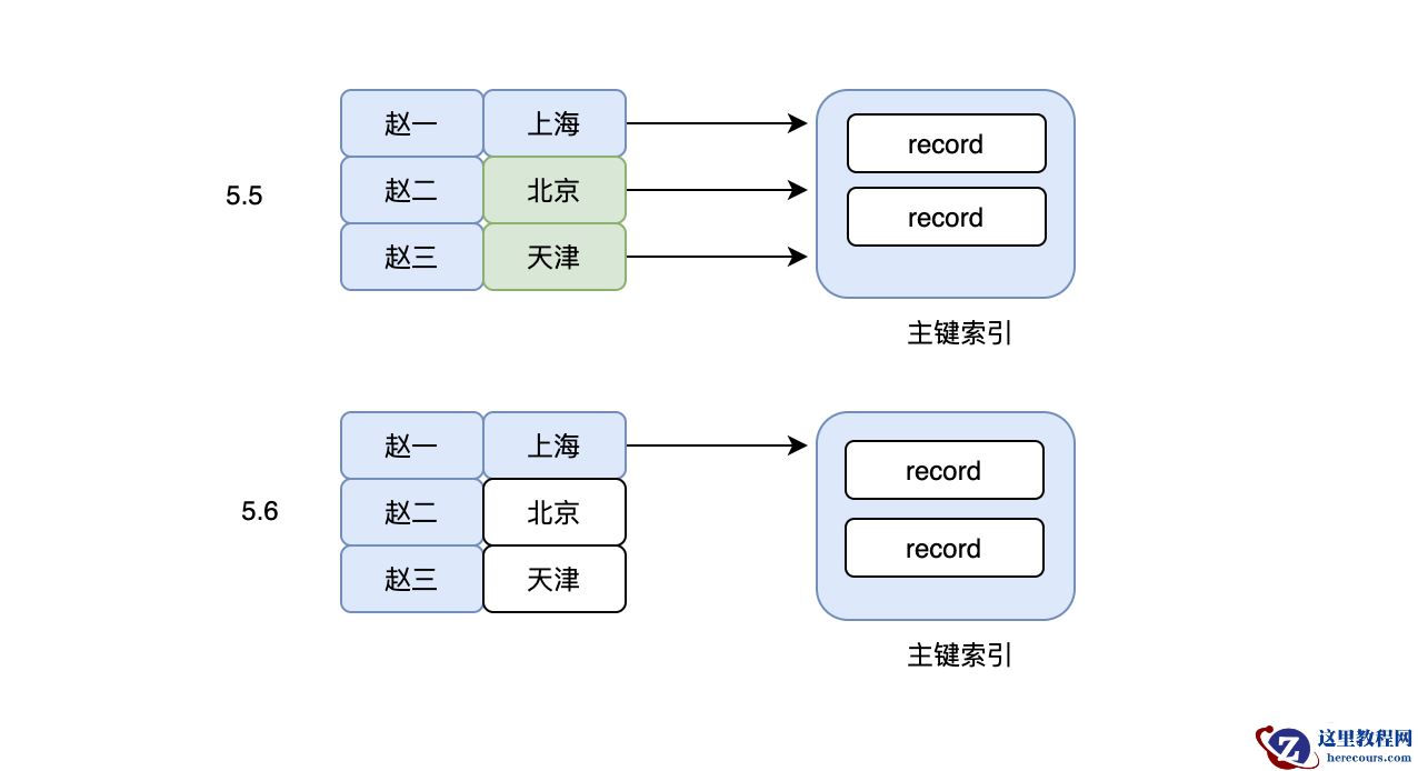 但是这里需要注意的是,因为使用了A的一部分,在MySQL5.6之前,上面的sql在检索出所有A是“赵”开头的数据之后,就立马回表(使用的select *),然后再对比B是不是“上海市”这个判断,这里是不是有点懵?为什么B这个判断不直接在联合索引上判断,这样的话回表的次数不就少了吗?造成这个问题的原因还是因为使用了最左前缀的问题,导致索引虽然能使用部分A,但是完全用不到B,看起来是有点“傻”,于是在MySQL5.6之后,就出现了索引下推这个优化(Index Condition Pushdown),有了这个功能以后,虽然使用的是最左前缀,但是也可以在联合索引上搜索出符合A%的同时也过滤非B的数据,大大减少了回表的次数。