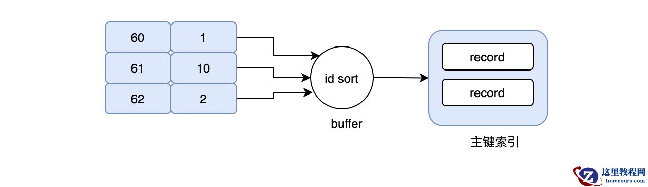 id=2完全可以合并,读一次page_no_1即可,不仅节省了IO,同时避免了随机IO,这就是MRR。当使用MRR之后,辅助索引不会立即去回表,而是将得到的主键id,放在一个buffer中,然后再对其排序,排序后再去顺序读主键索引,大大减少了离散的IO。