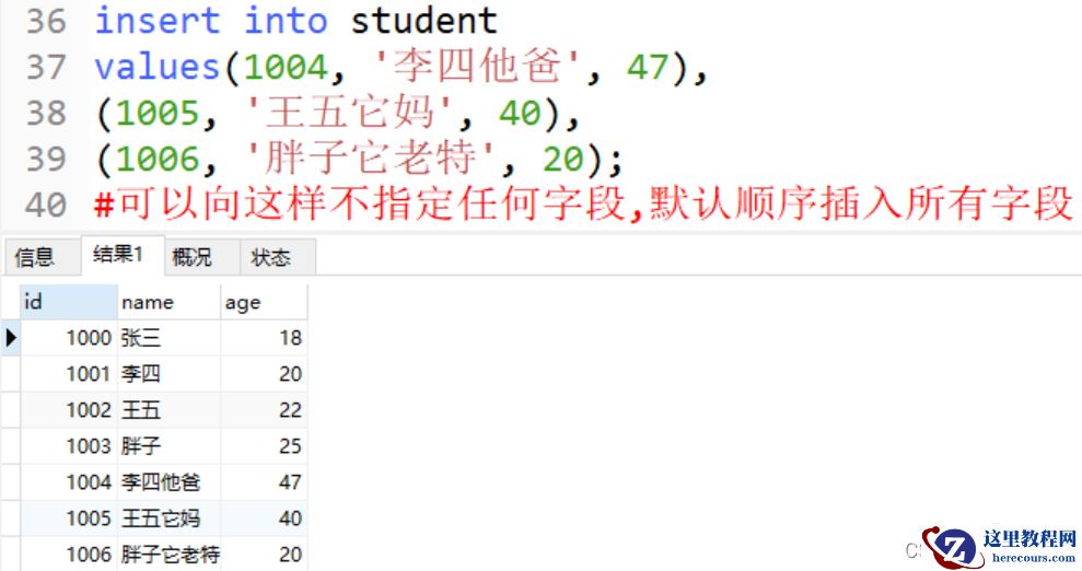 insert into student values(1004, '李四他爸', 47), (1005, '王五它妈', 40), (1006, '胖子它老特', 20); #可以向这样不指定任何字段,默认顺序插入所有字段