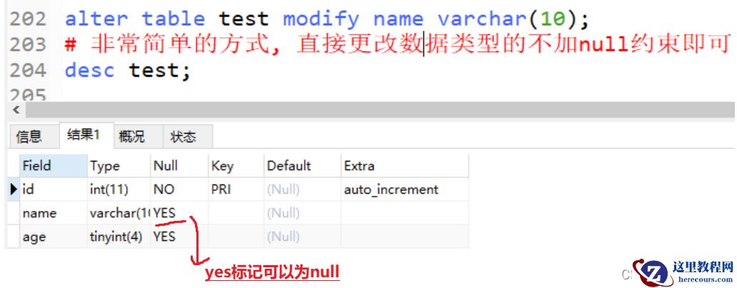 格式: alter table 表名 modify 字段名 数据类型[长度]alter table test modify name varchar(10); # 非常简单的方式, 直接更改数据类型的不加null约束即可 desc test;