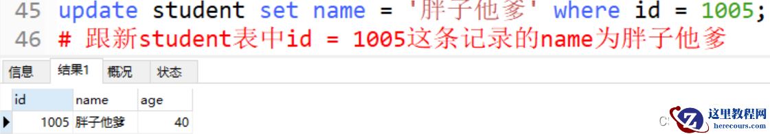 update student set name = '我是你爸', age = 100 where id = 1005; # 跟新student表中id = 1005这条记录的name为我是你爸, age为100