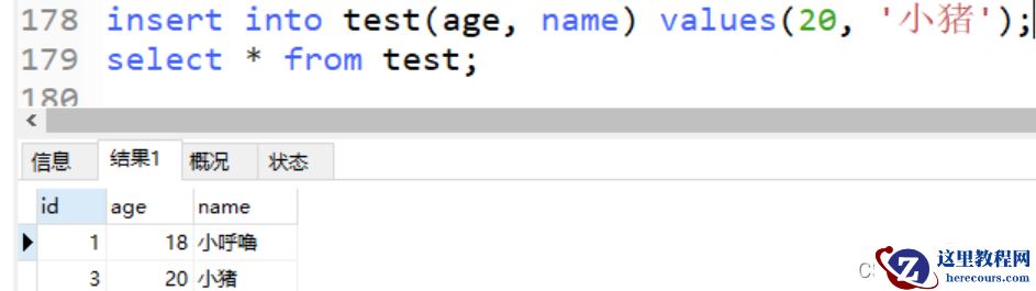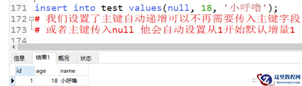 insert into test values(null, 18, '小呼噜'); # 我们设置了主键自动递增可以不再需要传入主键字段 # 或者主键传入null 他会自动设置从1开始默认增量1