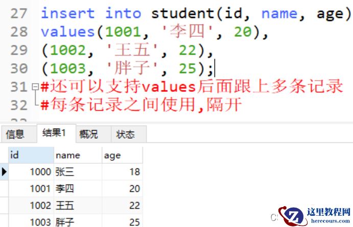 insert into student(id, name, age) values(1001, '李四', 20), (1002, '王五', 22), (1003, '胖子', 25); #还可以支持values后面跟上多条记录 #每条记录之间使用,隔开