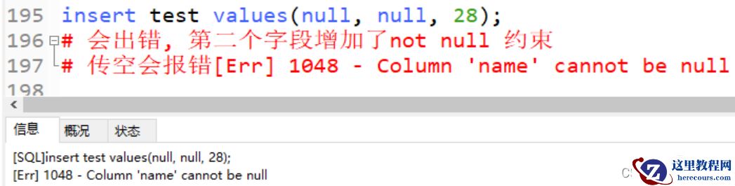 insert test values(null, null, 28); # 会出错, 第二个字段增加了not null 约束 # 传空会报错[Err] 1048 - Column 'name' cannot be null
