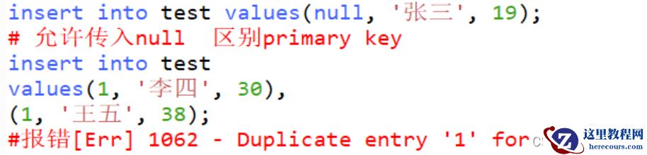 insert into test values(null, '张三', 19); # 允许传入null 区别primary key insert into test values(1, '李四', 30), (1, '王五', 38); #报错[Err] 1062 - Duplicate entry '1' for key 'id'