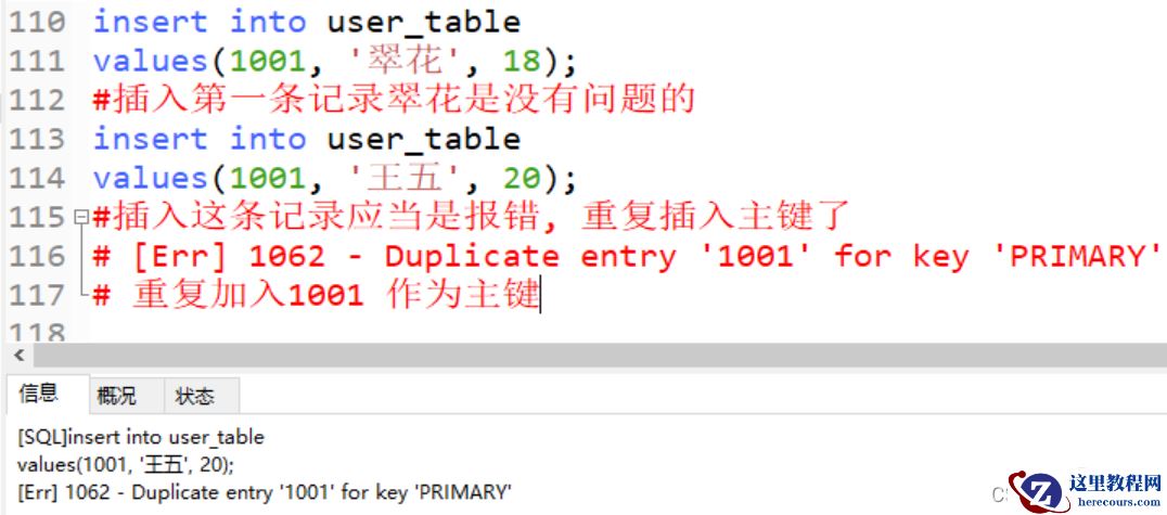 insert into user_table values(1001, '翠花', 18); #插入第一条记录翠花是没有问题的 insert into user_table values(1001, '王五', 20); #插入这条记录应当是报错, 重复插入主键了 # [Err] 1062 - Duplicate entry '1001' for key 'PRIMARY' # 重复加入1001 作为主键