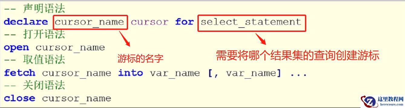游标(cursor)是庸才存储查询结果集的数据类型,在存储过程和函数中可以使用光标对结果集进行循环的处理,光标的使用包括光标的声明、OPEN、FETCH、CLOSE