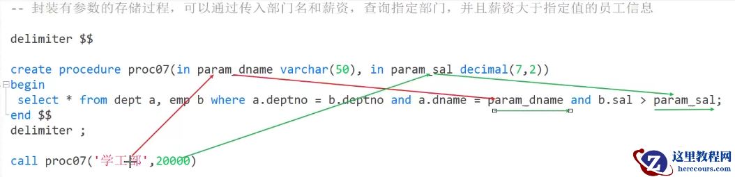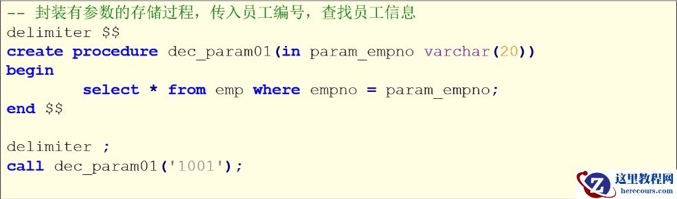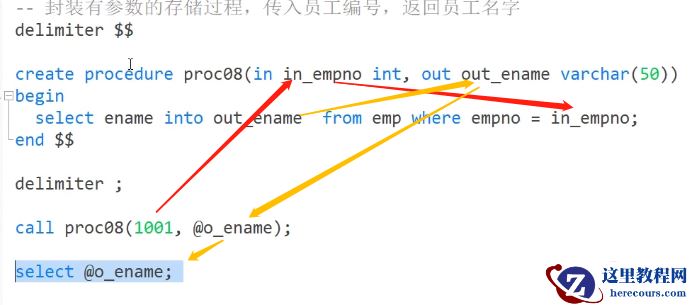 delimiter $$ create procedure proc06(in param_empno int) begin select*from emp where empno = param_empno end $$ delimiter ; call proc06(1001);