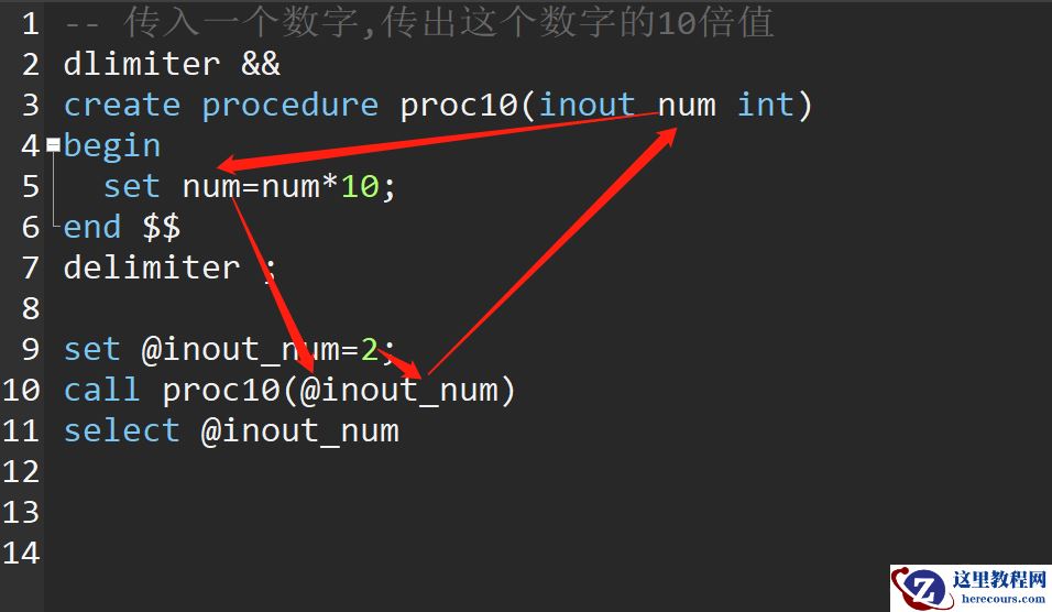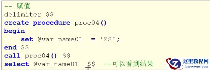 delimiter $$ create procedure proc02() begin declare var_name01 varchar(20) default 'aaa'; -- 声明/定义变量 set var_naem01 = 'zhangsan'; -- 给变量赋值 select var_name01; -- 输出变量的值 end $$ dilimiter ; call proc02();