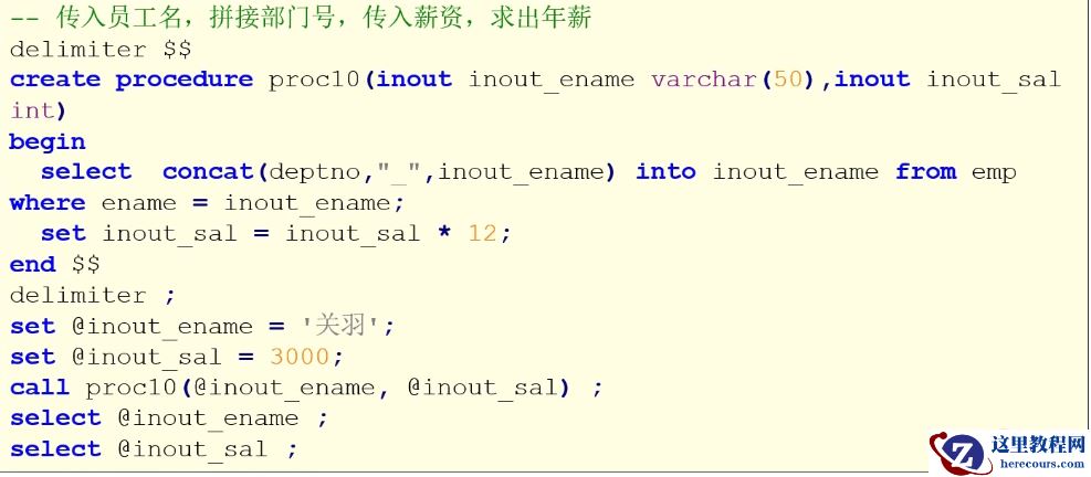 select sal into var_sal from emp where ename=in_eanme; -- 将值赋给局部变量