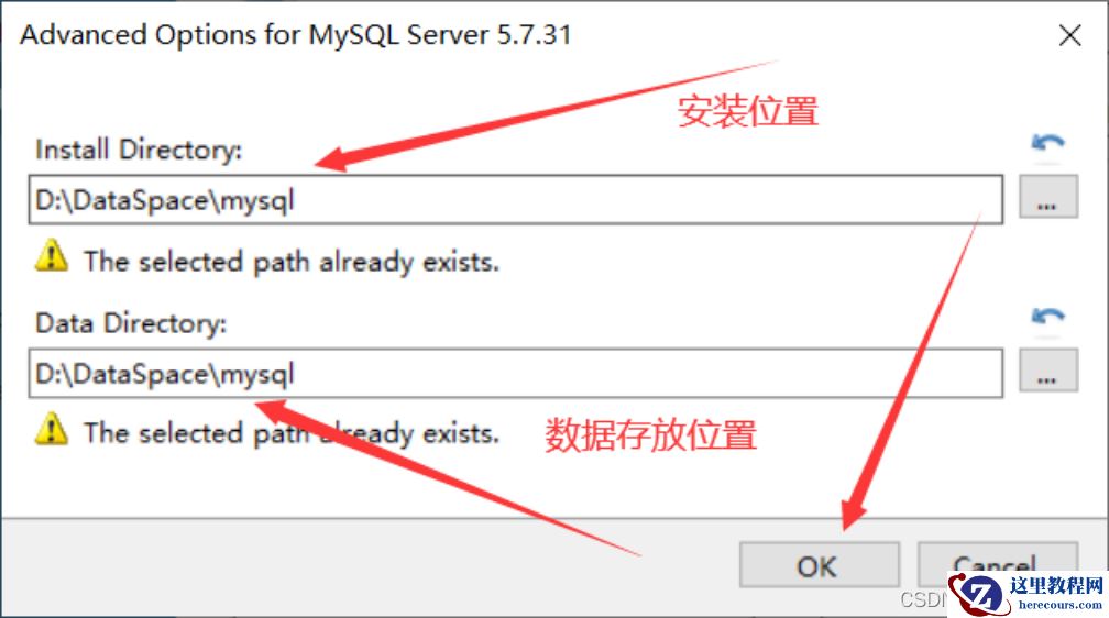 4. 自定义安装路径和数据存放路径,更改完成之后点击“OK”