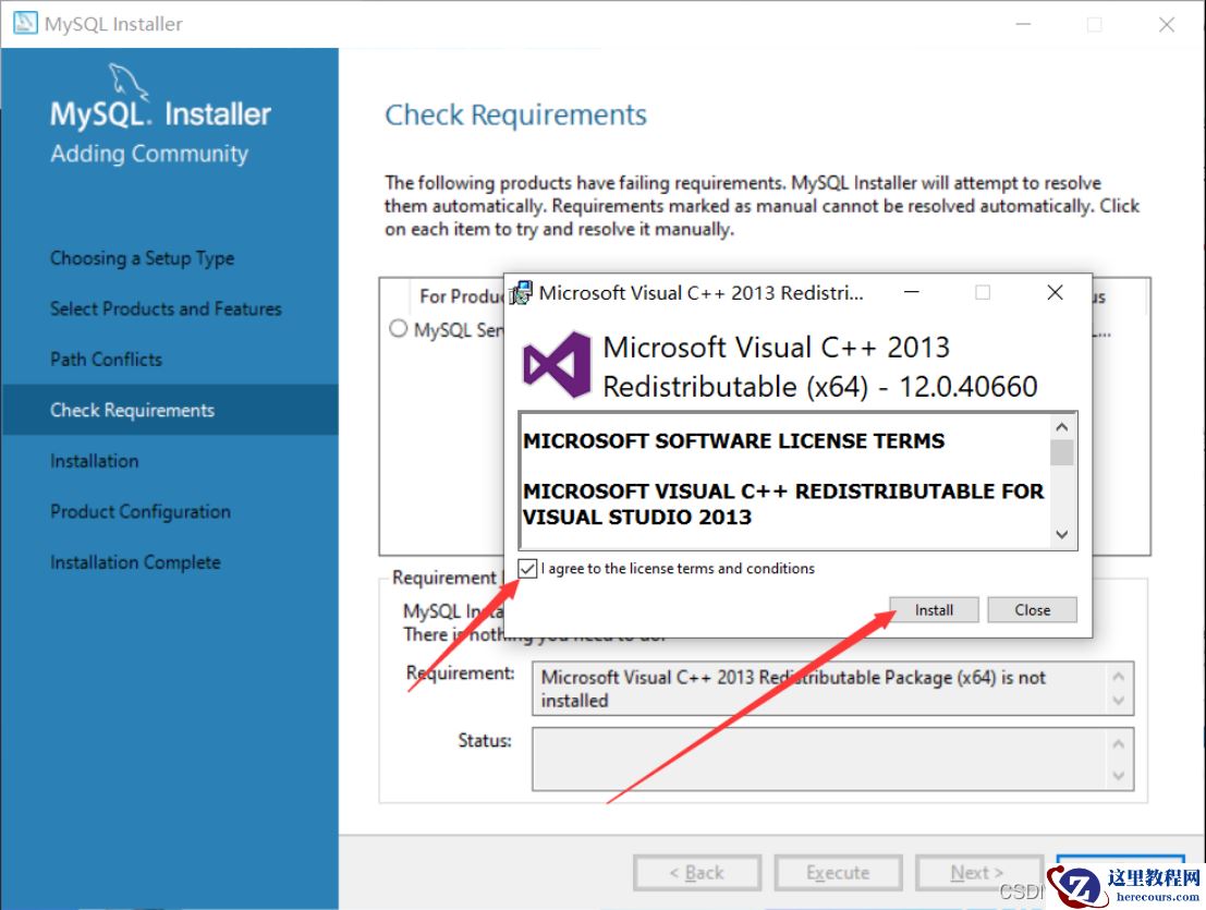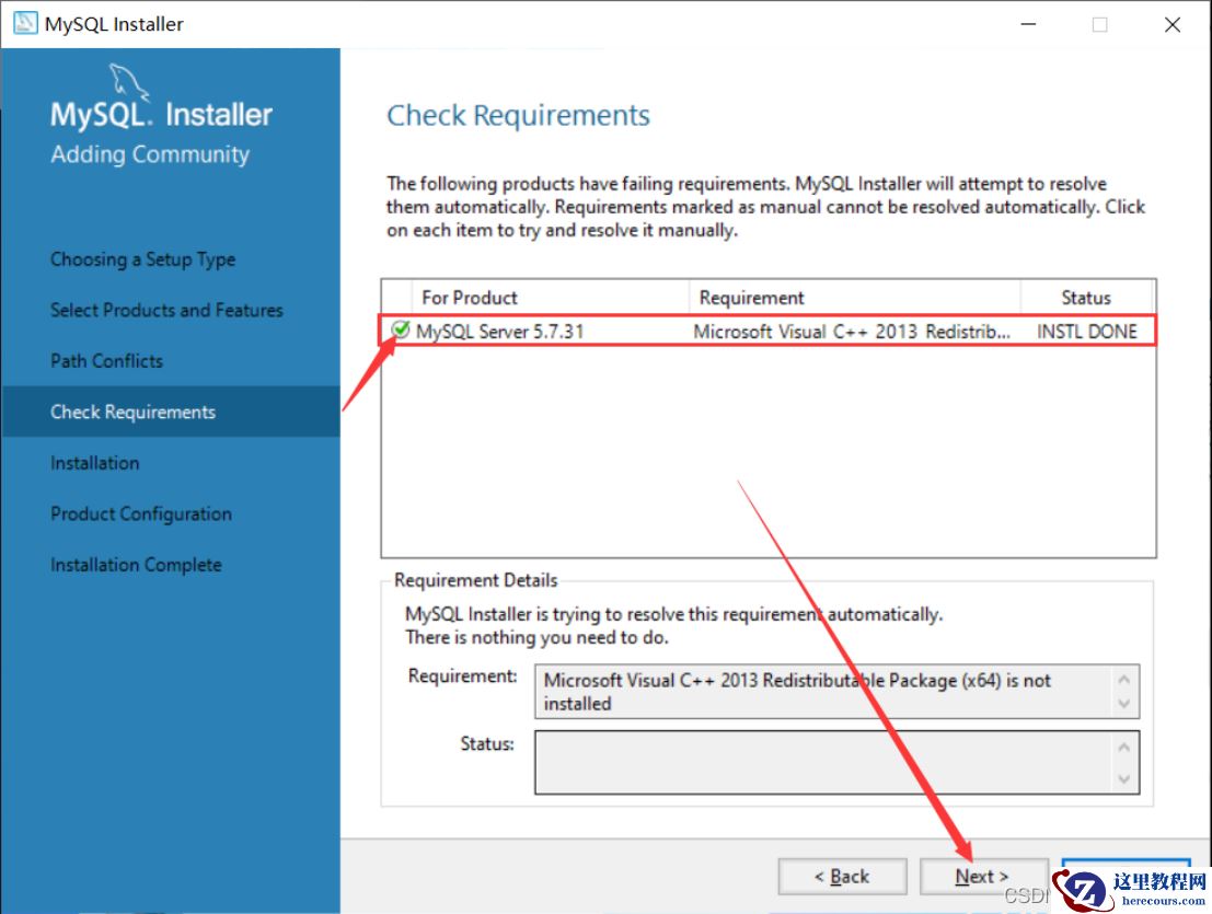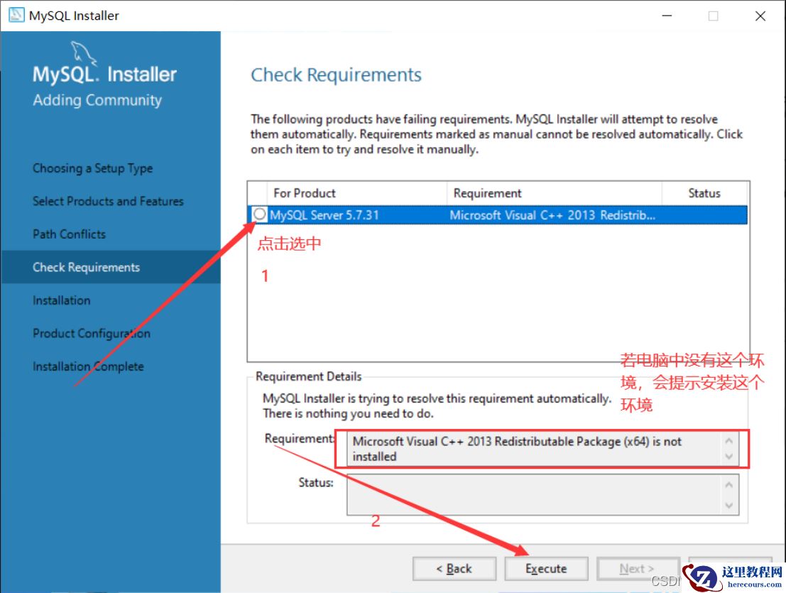 9. 先选中“MySQL Server5.7.31”,若电脑中没有这个环境,会提示安装“Microsoft Visual C++ 2013”环境,点击“Execute”