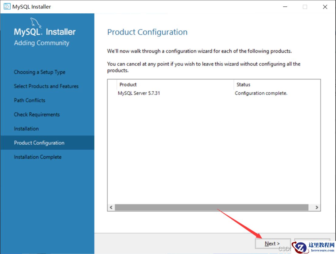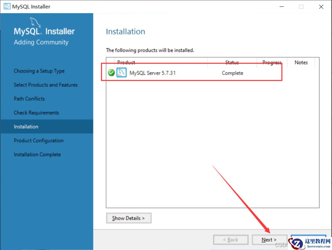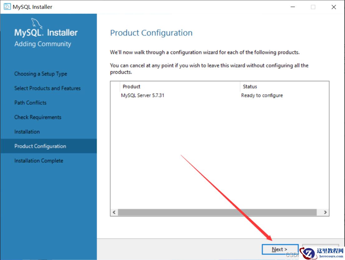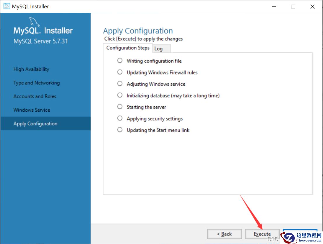 9. 先选中“MySQL Server5.7.31”,若电脑中没有这个环境,会提示安装“Microsoft Visual C++ 2013”环境,点击“Execute”