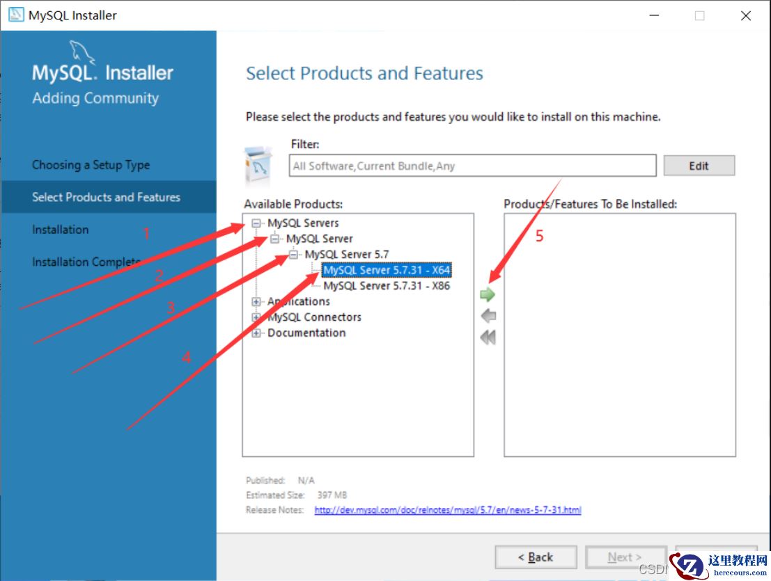 依次点开“MySQL Servers”、“MySQL Servers”、“MySQL Servers 5.7”、“MySQL Servers 5.7.31 -64”,然后点击绿色箭头将选中的版本移植到右边选中框中