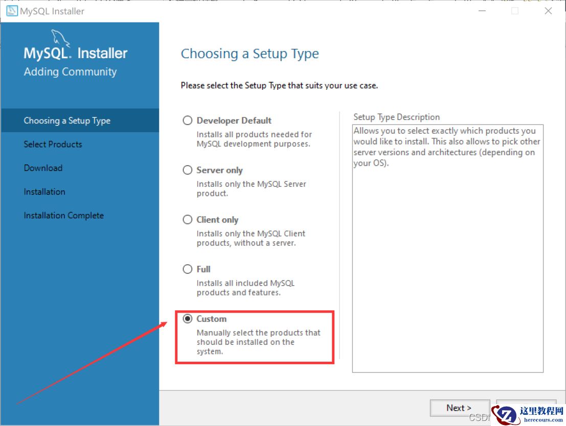双击运行mysql-installer-community-5.7.31.0.msi,这里选择是自定义安装,所以直接选择“Custom”,点击“Next”