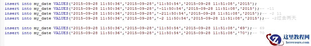 insert into my_date VALUES('2015-09-28 11:50:36','2015-09-28','-2 11:50:54','2015-09-28 11:51:08','2015');-- -2过去两天