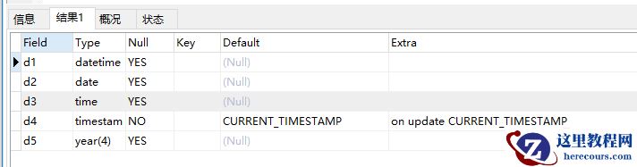 create table my_date( d1 datetime, d2 date, d3 time, d4 timestamp, d5 year )charset utf8; desc my_date