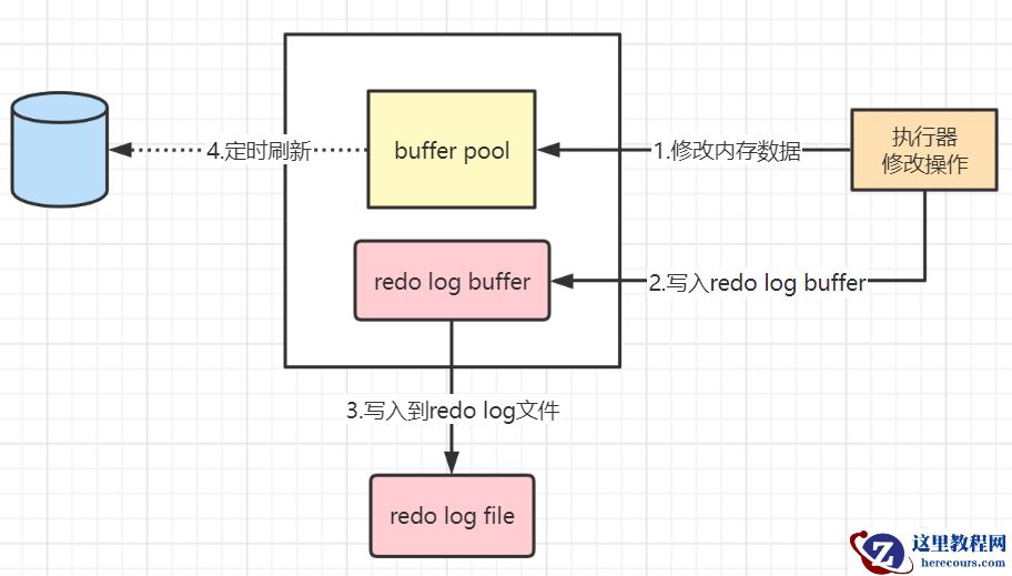 因为buffer pool是在内存中的区域,系统意外崩溃的话数据有可能会丢失,有些脏数据可能会来不及刷新到磁盘,事务的持久性得不到保证。因此,引入了redo log。修改数据时,额外记录一次日志,内容是xx页xx偏移量发生了xx变化,当系统崩溃时可以根据日志内容进行恢复。