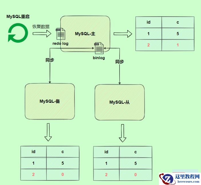 由于binlog没写完就异常,这时候binlog里面没有对应的修改记录。因此,之后用binlog日志恢复数据或者slave读取master的binlog时,就会少这一次更新,恢复出来的这一行c值是0,而原库因为redo log日志恢复,这一行c值是1,最终数据不一致。