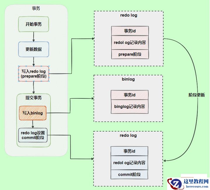 为了解决两份日志之间的逻辑一致问题,InnoDB存储引擎使用两阶段提交方案。将redo log拆成了两个步骤prepare和commit,这就是两阶段提交。