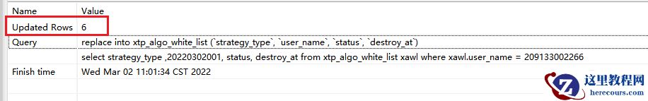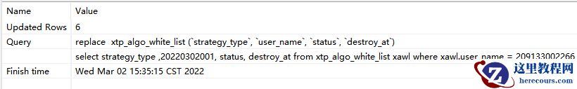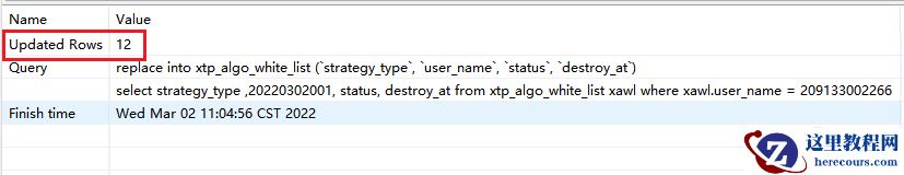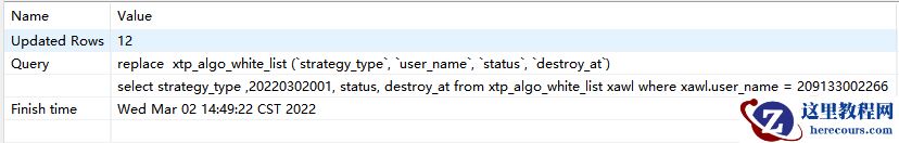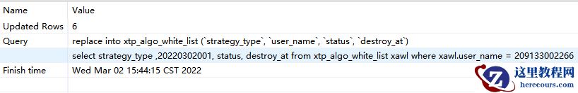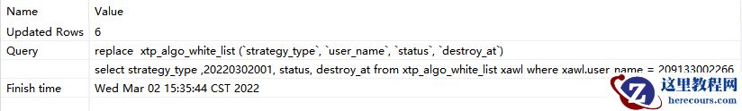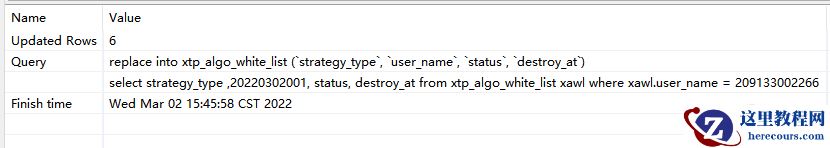 # 此时执行的是replace replace xtp_algo_white_list (`strategy_type`, `user_name`, `status`, `destroy_at`) select strategy_type ,20220302001, status, destroy_at from xtp_algo_white_list xawl where xawl.user_name = 209133002266;