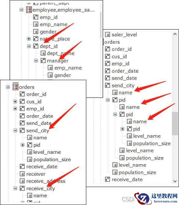 SELECT Contract.SUM(price), Payment.SUM(amount), Invoice.SUM(amount) ON date FROM Contract GROUP BY date FULL JOIN Payment GROUP BY date FULL JOIN Invoice GROUP BY date这里需要把date在SELECT后单独列出来表示结果集按日期对齐。 这种写法,不必关心这三个表之间的关联关系,各自写各自有关的部分就行,似乎这几个表就没有关联关系,把它们连到一起的就是那个要共同对齐的维度(这里是date)。 这几种JOIN情况还可能混合出现。 继续举例,延用上面的合同表,再有客户表和销售员表