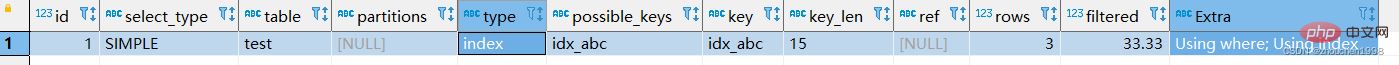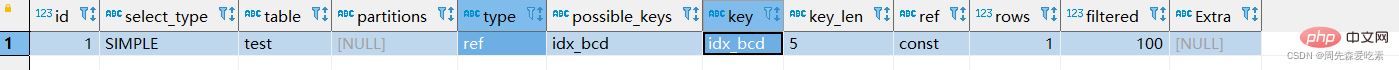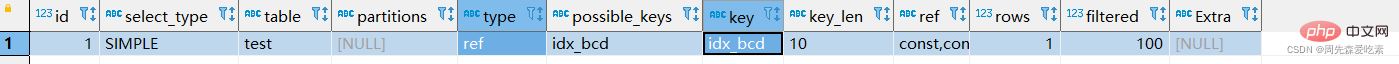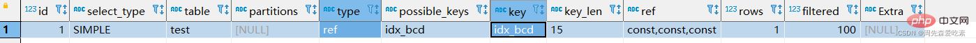 id|select_type|table|partitions|type|possible_keys|key |key_len|ref |rows|filtered|Extra | --+-----------+-----+----------+----+-------------+-------+-------+-----------+----+--------+-----------+ 1|SIMPLE |test | |ref |idx_bcd |idx_bcd|10 |const,const| 1| 100.0|Using index| i d|select_type|table|partitions|type |possible_keys|key |key_len|ref|rows|filtered|Extra | --+-----------+-----+----------+-----+-------------+-------+-------+---+----+--------+------------------------+ 1|SIMPLE |test | |index|idx_bcd |idx_bcd|15 | | 3| 33.33|Using where; Using index|