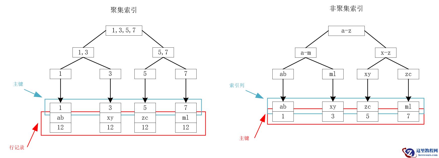 MySQL底层使用B+树来存储索引,数据均存在叶子节点上。对于InnoDB而言,主键索引和行记录时存储在一起的,因此叫做聚集索引(clustered index)。除了聚集索引,其他所有都叫做非聚集索引(secondary index),包括普通索引、唯一索引等。
