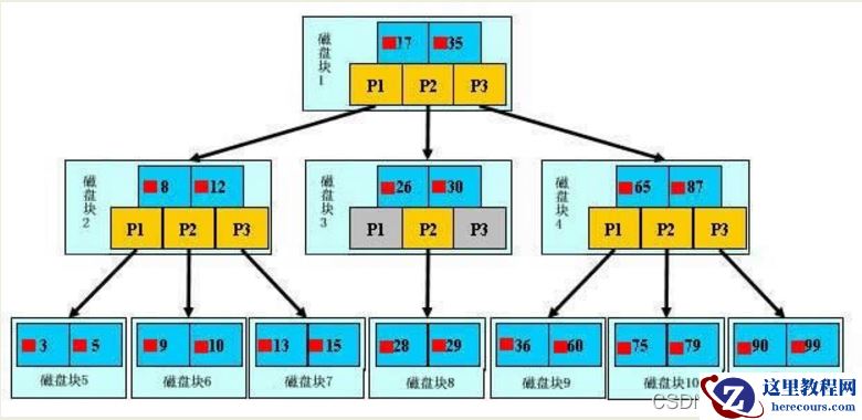一颗b树,浅蓝色的块我们称之为一个磁盘块,可以看到每个磁盘块包含几个数据项(深蓝色所示)和指针(黄色所示),如磁盘块1包含数据项17和35,包含指针P1、P2、P3。P1表示小于17的磁盘块,P2表示在17和35之间的磁盘块,P3表示大于35的磁盘块。