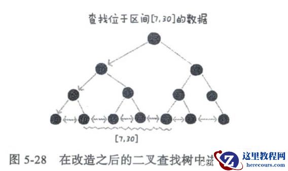 为了支持按照区间快速查找数据,我们对二叉查找树进行改造,将二叉查找树的叶子节点用链表串起来,如果要查找某个区间的数据,只需要用区间的起始值,在树中进行查找,当定位到有序链表中的某个节点之后,再从这个节点开始顺着有序链表往后遍历,直到有序链表中的节点数据值大于区间终止值为止。