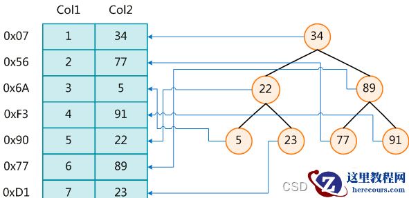 为了加快Col2的查找,可以维护一个右边所示的二叉查找树,每个节点分别包含索引键值和一个指向对应数据记录物理地址的指针,这样就可以运用二叉查找在一定的复杂度内获取到相应数据,从而快速的检索出符合条件的记录。
