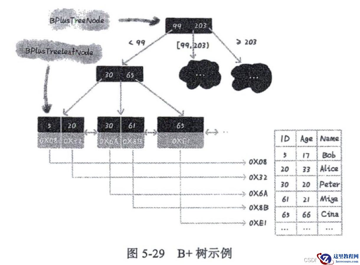如果要查找数据项29,那么首先会把磁盘块1由磁盘加载到内存,此时发生一次IO,在内存中用二分查找确定29在17和35之间,锁定磁盘块1的P2指针,内存时间因为非常短(相比磁盘的IO)可以忽略不计,通过磁盘块1的P2指针的磁盘地址把磁盘块3由磁盘加载到内存,发生第二次IO,29在26和30之间,锁定磁盘块3的P2指针,通过指针加载磁盘块8到内存,发生第三次IO,同时内存中做二分查找找到29,结束查询,总计三次IO。