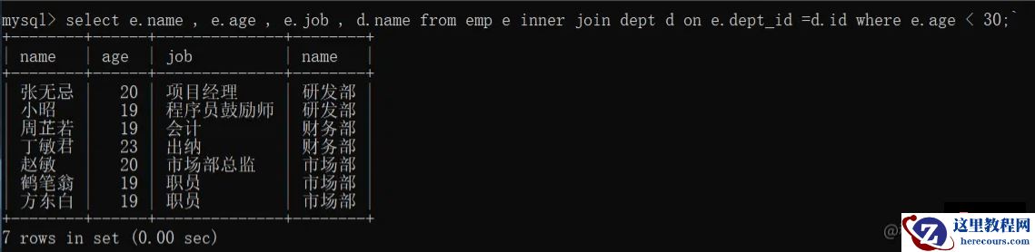 select e.name , e.age , e.job , d.name from emp e inner join dept d on e.dept_id =d.id where e.age < 30;