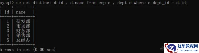 select distinct d.id , d.name from emp e , dept d where e.dept_id = d.id;