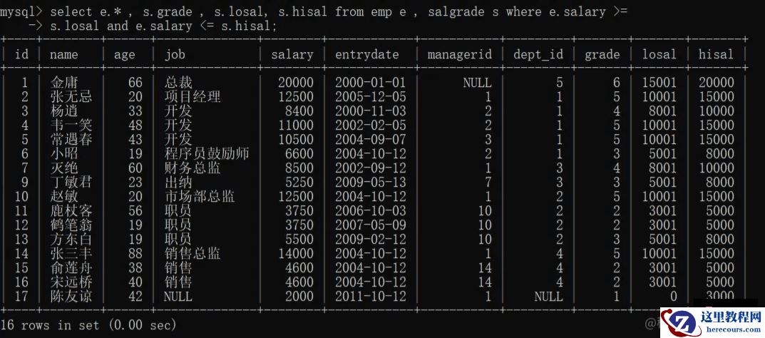 -- 方式一 select e.* , s.grade , s.losal, s.hisal from emp e , salgrade s where e.salary >= s.losal and e.salary <= s.hisal; -- 方式二 select e.* , s.grade , s.losal, s.hisal from emp e , salgrade s where e.salary between s.losal and s.hisal;