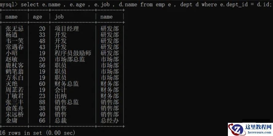select e.name , e.age , e.job , d.name from emp e , dept d where e.dept_id = d.id;