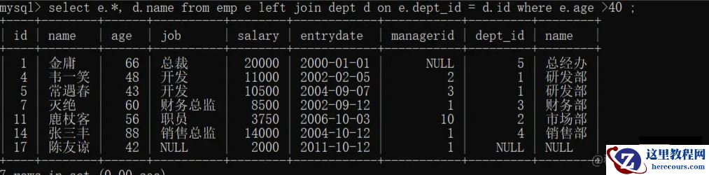 select e.*, d.name from emp e left join dept d on e.dept_id = d.id where e.age >40 ;