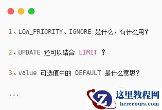 2、 UPDATE 语法中的 LOW_PRIORITY 很少用, IGNORE 偶尔用, ORDER BY 和 LIMIT 相对会用的多一点,都混个眼熟