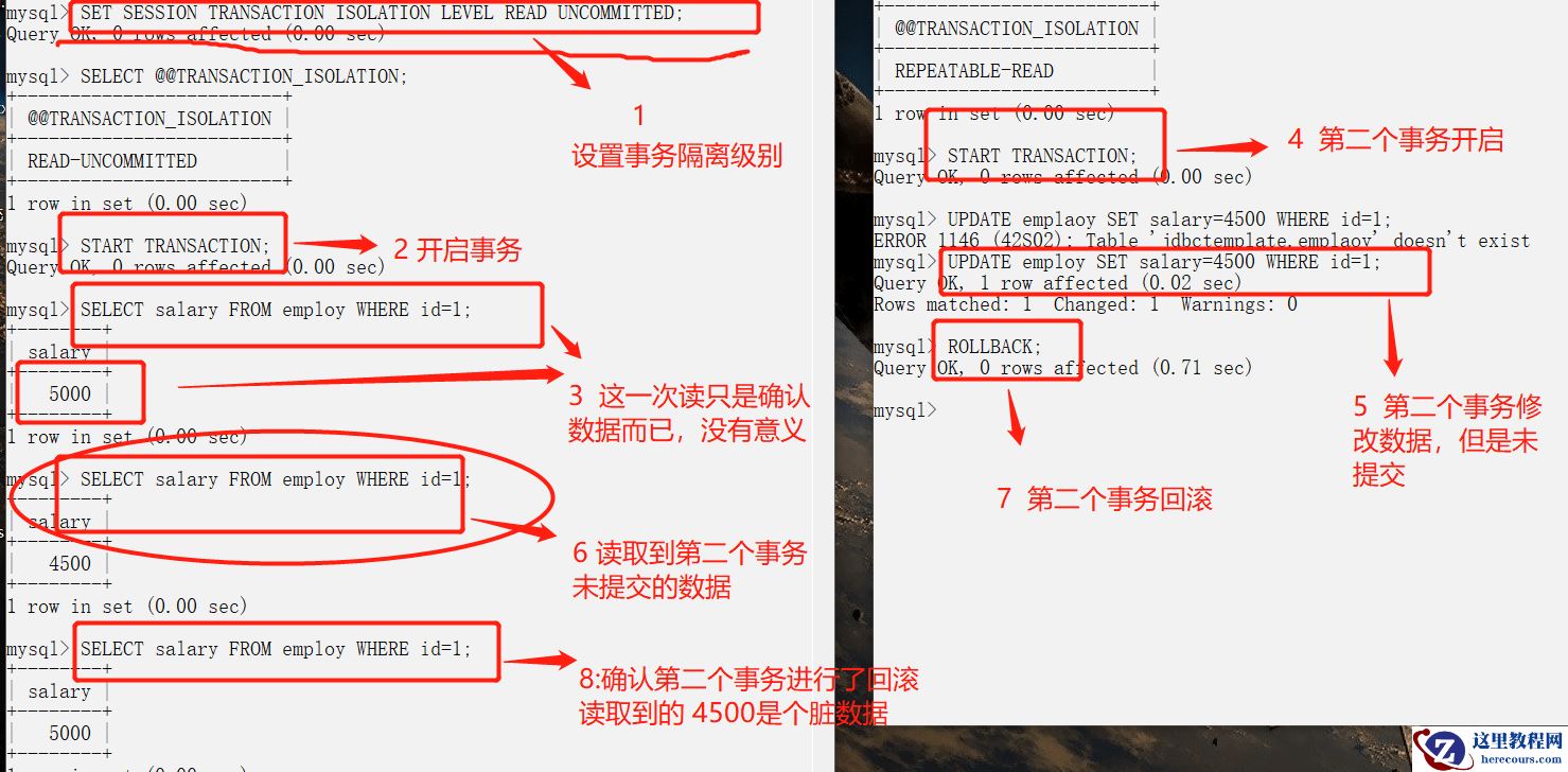 **脏读(Dirty read):**当一个事务正在访问数据并且对其进行了修改,但是还没提交事务,这时另外一个事务也访问了这个数据,然后使用了这个数据,因为这个数据的修改还没提交到数据库,所以另外一个事务读取的数据就是“脏数据”,这种行为就是“脏读”,依据“脏数据”所做的操作可能是会出现问题的。 修改丢失(Lost of modify):是指一个事务读取一个数据时,另外一个数据也访问了该数据,那么在第一个事务修改了这个数据之后,第二个事务也修改了这个数据。这样第一个事务内的修改结果就被丢失,这种情况就被称为修改丢失。例如:事务1读取表中数据A=20,事务2也读取