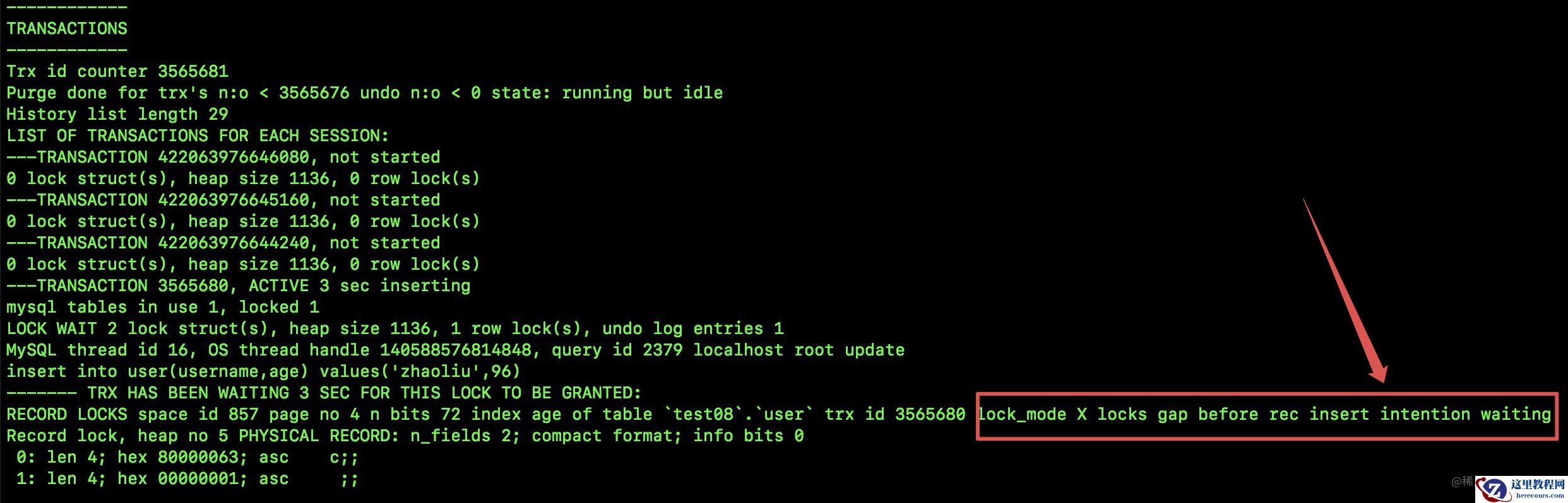 在输出的内容中,红色框选中的地方,清楚的表明了插入意向锁的存在。