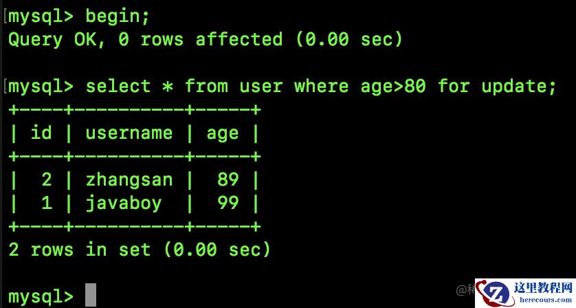 首先在会话 A 中执行如下 SQL 查询 age 大于 80 的记录,并添加排他锁: