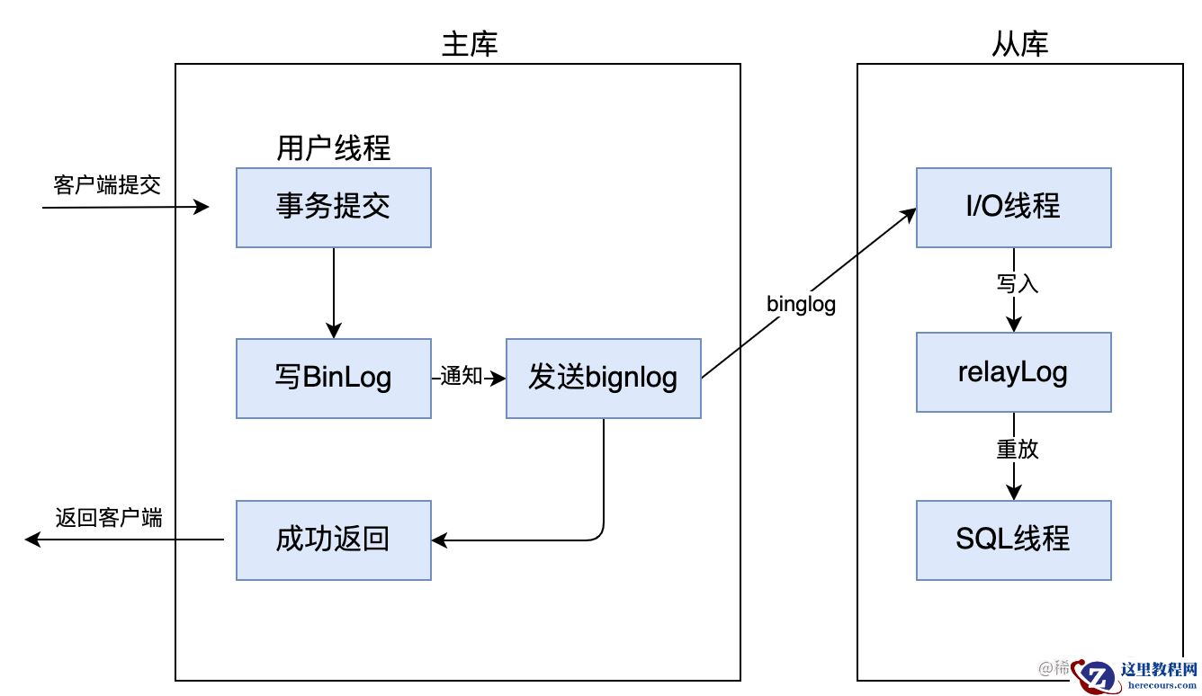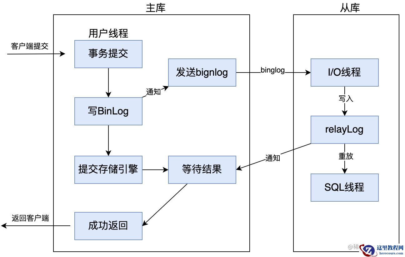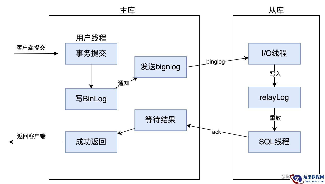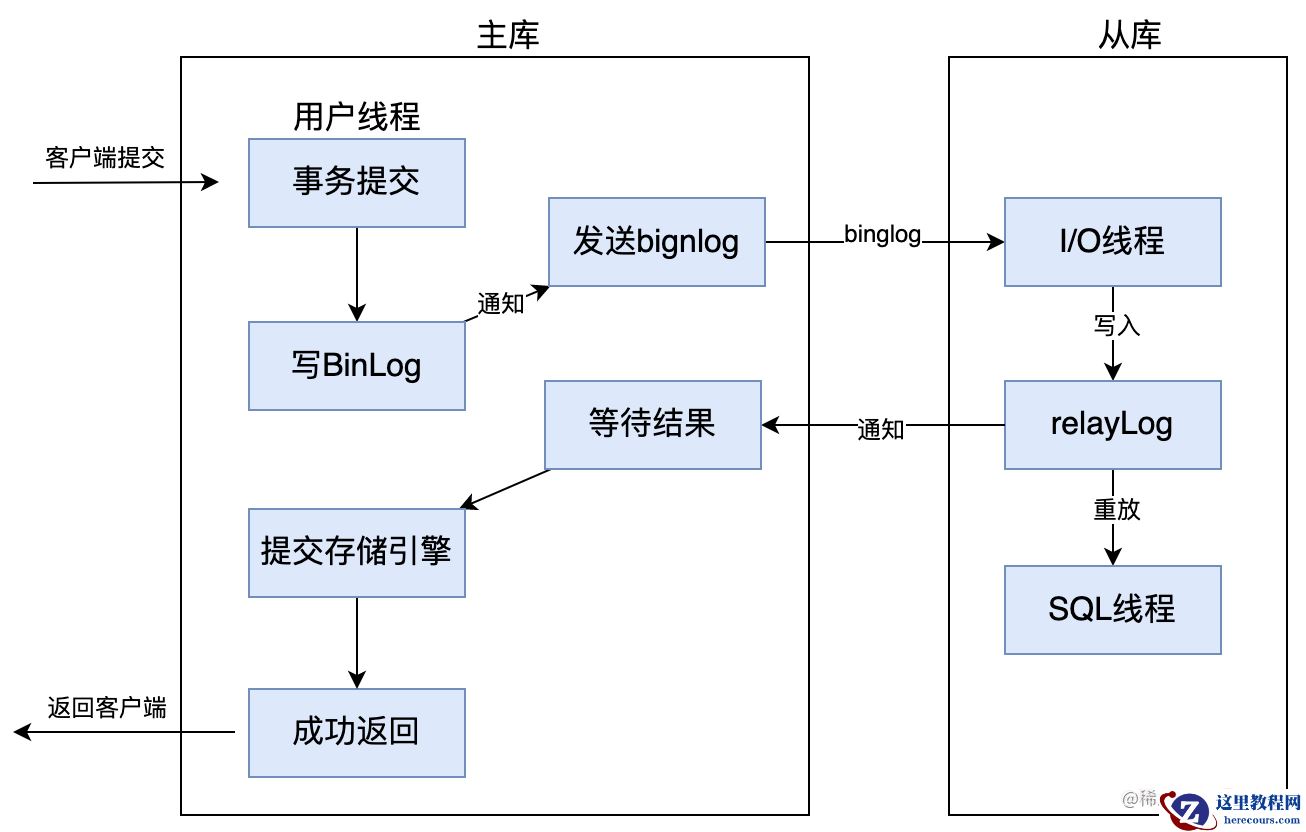 而异步复制,就是当主库提交事物后,会通知binlog dump线程发送binlog日志给从库,一旦binlog dump线程将binlog日志发送给从库之后,不需要等到从库也同步完成事务,主库就会将处理结果返回给客户端。